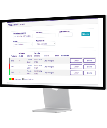 O SysPath agrupa os exames por data de vencimento, com um sistema de cores. Cada cor refere-se a um prazo designado pelo MV Patologista. Isso permite maior controle e acompanhamento dos exames que estão "Recentes", "A vencer" e "Vencidos".